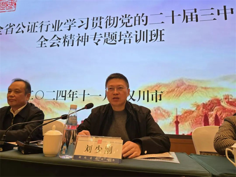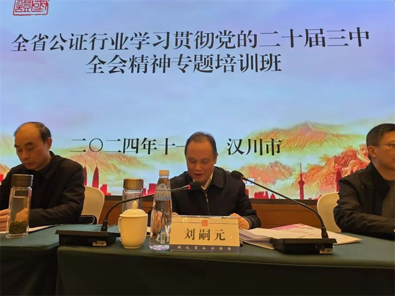 11月28-29日,湖北省公证协会在汉川市举办全省公证行业学习贯彻党的二十届三中全会精神专题培训班。省公证协会刘嗣元会长、龚凌志副会长,省司法厅公共法律服务管理处刘少刚处长、徐金霞副处长,孝感市司法局胡志春副局长等领导出席培训班开班式,胡志春副局长进行了致辞,刘嗣元会长做了开班动员,刘少刚处长进行了讲话指导。